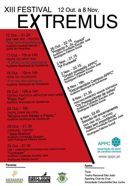 Promovido pela Associação do Porto de Paralisia Cerebral (APPC), está a decorrer, até ao dia 8 de novembro, a 13.ª edição do Festival EXTREMUS - Festival Internacional de Expressões na Música, Dança e Teatro, com sessões que decorrem na Junta de Freguesia de Paranhos, no Auditório Municipal de Gondomar e na Fábrica Social.