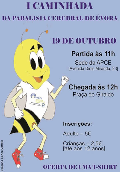 Amanhã, dia 19 de outubro, a Associação de Paralisia Cerebral de Évora (APCE) vai organizar a primeira Caminhada da Paralisia Cerebral de Évora, com partida marcada para as 11h00 na sede da APCE [os participantes deverão chegar meia hora mais cedo].