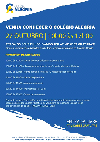 No dia 27 de outubro, das 10h00 às 17h00 o Colégio da Alegria, situado junto ao Largo do Rato, em Lisboa, está aberto a todos os que queiram conhecer as atividades curriculares e extracurriculares deste novo estabelecimento de ensino.