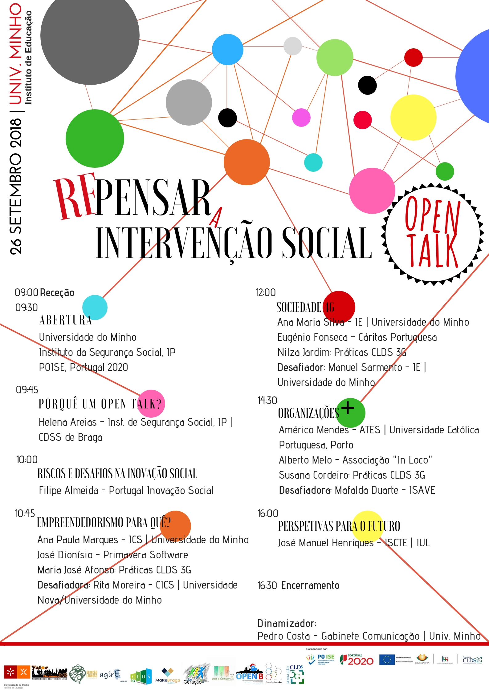 A 26 de setembro realiza-se na Universidade do Minho o Open Talk “(Re) Pensar a Intervenção Social”, uma iniciativa que se propõe procurar novos rumos e sentidos para a ação, assumindo-se como um importante momento de abertura a uma comunidade mais ampla, que permitirá a discussão com diversos peritos de renome nacional e uma aprendizagem conjunta que beneficiará a ação futura.