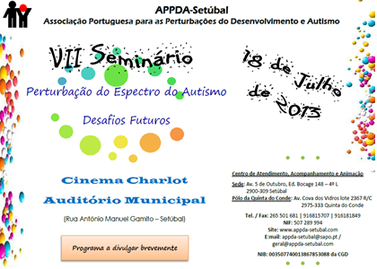 Organizado pela APPDA-Setúbal - Associação Portuguesa para as Perturbações do Desenvolvimento e Autismo, este seminário realiza-se a 18 de julho, a partir das 8h30, no Auditório Municipal – Cinema Charlot, em Setúbal.