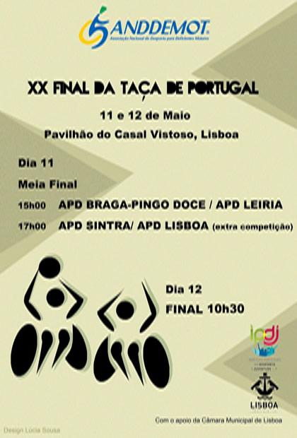 Com o apoio da ANDDEMOT – Associação Nacional de Desporto para Deficientes Motores, a XX Final da Taça de Portugal realiza-se sábado e domingo, 11 e 12 de maio, respetivamente, no Pavilhão do Casal Vistoso, em Lisboa.