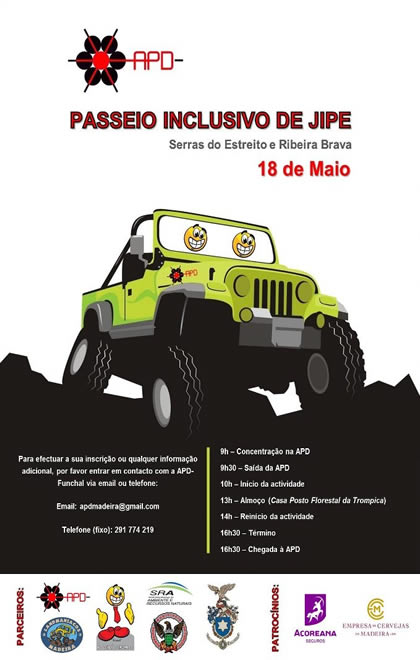 No dia 18 de maio, a APD Funchal organiza um Passeio Inclusivo de Jipe pelas Serras do Estreito de Câmara de Lobos e pela Ribeira Brava, seguido de um convívio para almoço na Casa Posto Florestal da Trompica, pelas 13h00.