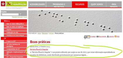 O Instituto Nacional para a Reabilitação, I. P. (INR,I.P.) convidou a revista Plural&Singular para integrar a secção de Boas Práticas do seu site www.inr.pt.