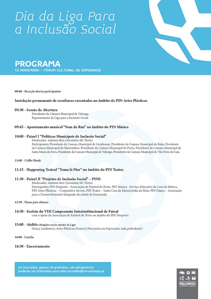 O Dia para a Inclusão Social vai decorrer no Fórum Cultural de Ermesinde, concelho de Valongo, estando a manhã reservada à área de projeto e políticas com responsáveis de câmaras municipais e técnicos de instituições e a tarde para oficinas, bem como para o sorteio do calendário do campeonato de futsal.