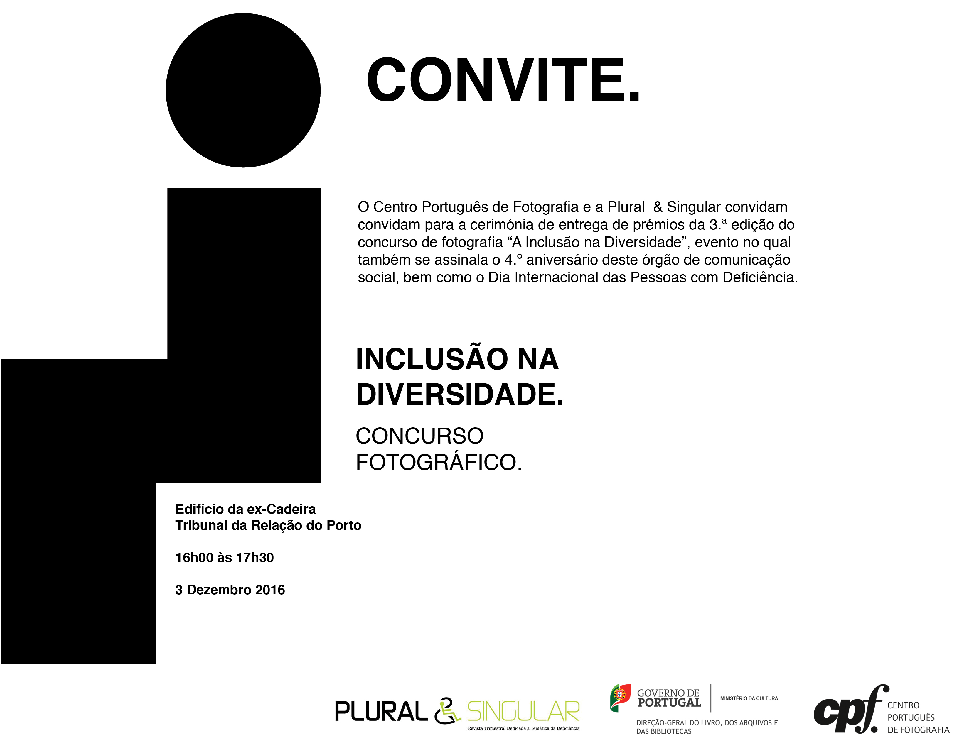 No sábado, 03 de dezembro, comemora-se o Dia Internacional da Pessoa com Deficiência e, partindo da convicção de que assinalar, divulgar e refletir sobre o real significado desta data é missão de TODOS, a Plural&Singular criou o concurso de fotografia “A Inclusão na Diversidade” e o Centro Português de Fotografia aceitou o desafio de ser parceiro desta iniciativa que já vai na 3.º edição.