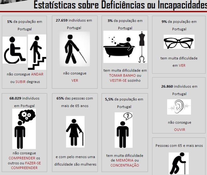 O Gabinete de Estratégia e Planeamento (GEP) divulgou um relatório, no qual é afirmado que quase um milhão de portugueses não consegue andar ou subir escadas, enquanto quase 28 mil são cegos, cerca de 27 mil são surdos e rondam as 69 mil as pessoas com dificuldades intelectuais.