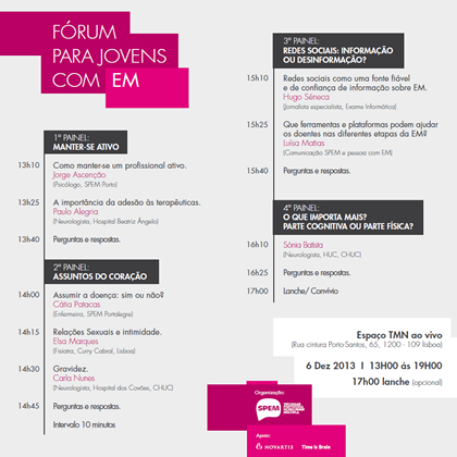 A Sociedade Portuguesa de Esclerose Múltipla (SPEM) ao organizar este fórum, no âmbito do Dia Nacional da Esclerose Múltipla que se comemora a 4 de dezembro decidiu disponibilizar o acompanhamento desta iniciativa através da plataforma de live stream, disponível mediante registo no site www.academia35.pt